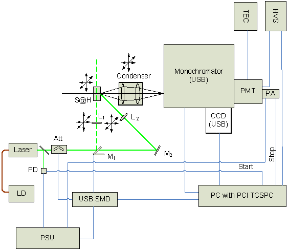 The advent of sub-nanosecond and picosecond pulsed Diode Pumped Solid State Lasers (DPSSL) with appropriate wavelengths, the availability of suitable detectors of sufficiently fast response time, and modern timing electronics that incorporate the complex acquisition technique into one PCI computer board makes it possible to design a very compact Fluorescence Lifetime Measurement Systems for the use in biological environments, medicine, chemical technology semiconductor’s nanotechnology, advanced optics materials technology, etc.